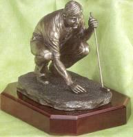 Several new competitions were introduced that year, two goblet style silver cups were provided by the society for a pairs competition in which partners are drawn on the day and has over the years, proved to be a very popular comp throwing up some very unlikely partnerships!! A rabbits trophy was also introduced to be played for on the same day as the Open Championship for players with handicaps of 24+ as well as two shields for a matchplay pairs competition in which you pick your own partners and a matchplay singles trophy, which is a magnificent copper and brass driver head made by one of the Abbey Panels apprentices. The social club also presented us with the Merit Trophy, a bronze statuette , to be played for throughout the year.with the proviso that it would only be open to social club members. This has brought added interest to the last game of the season , several times bringing it to a nailbiting conclusion to find the eventual winner. In 2001 with the closure of the Company and by definition the Social Club it was agreed that all members be eligible for the Merit Trophy